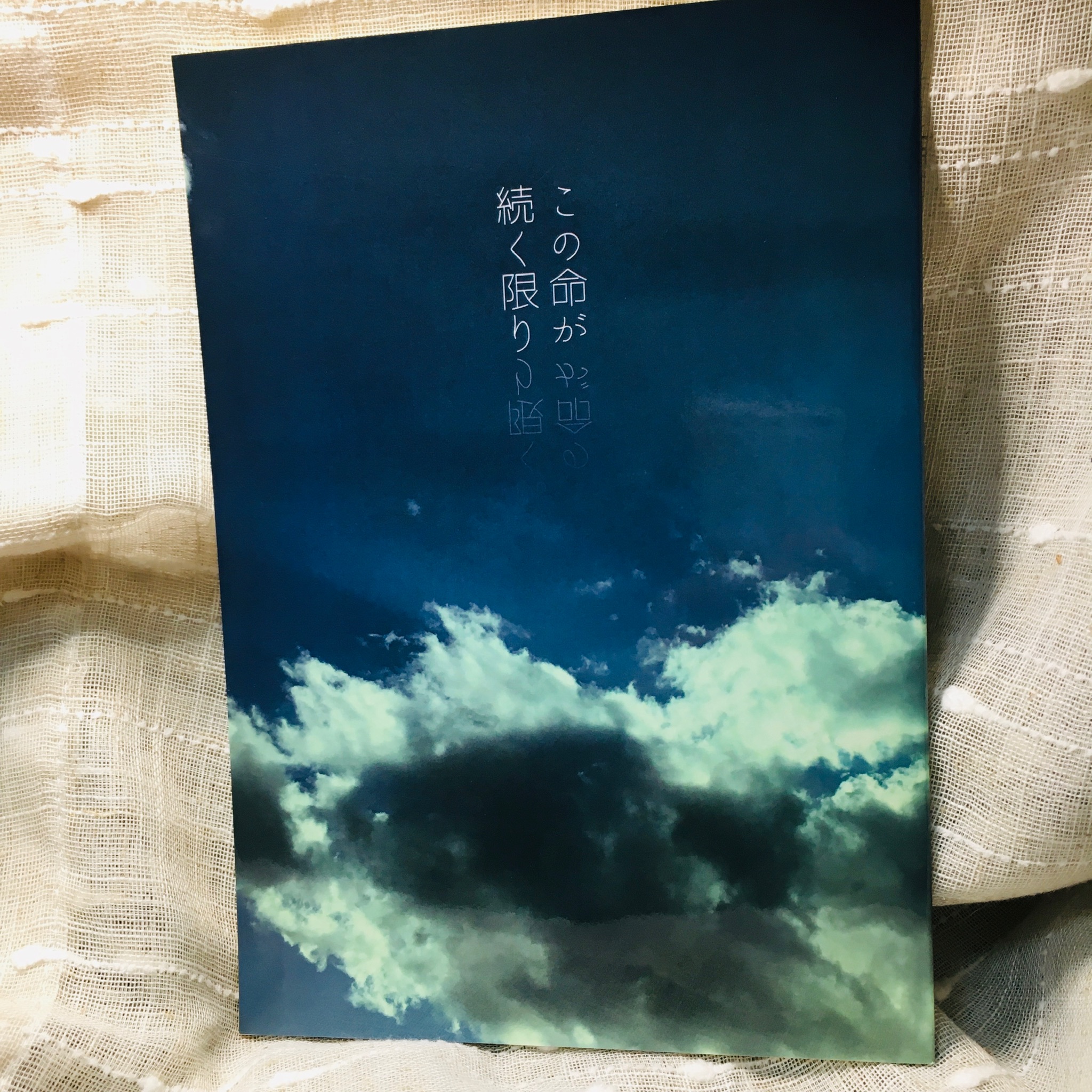 - 「沈み黙するもの」の続きをイメージして、空高く輝く太陽が雲の向こう側に在る写真を使いました。フォトショによる文字加工を試し出した頃なので、反転して透けさせるという小細工をしました。この頃はこれが精一杯だったのだ…