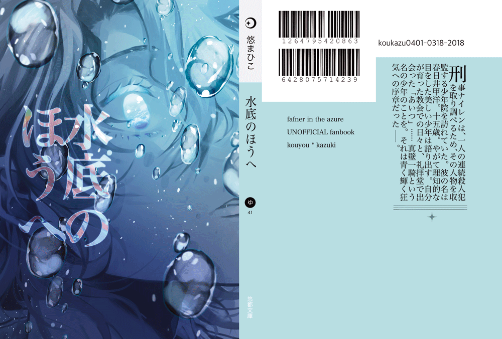 - 表紙絵:都辻さん。水底にいるキャラクターの瞳に映る空の色、という物語に合わせた表紙を描いて頂きました。某出版社をイメージした裏表紙です。帯はトレーシングペーパーで表紙を透かし、水底の雰囲気を大切にしています。またデザインのコンセプトや言葉の部分は、流流さんにお力添え頂きました。
